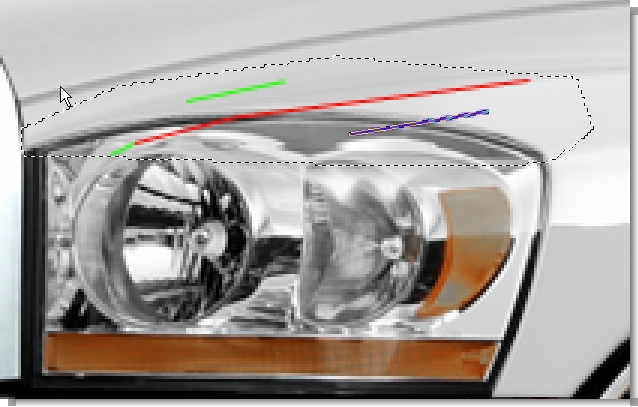 4- Une fois fait, observez bien les reflets sur la carrosserie (ici demarqué par une zone verte et bleu)